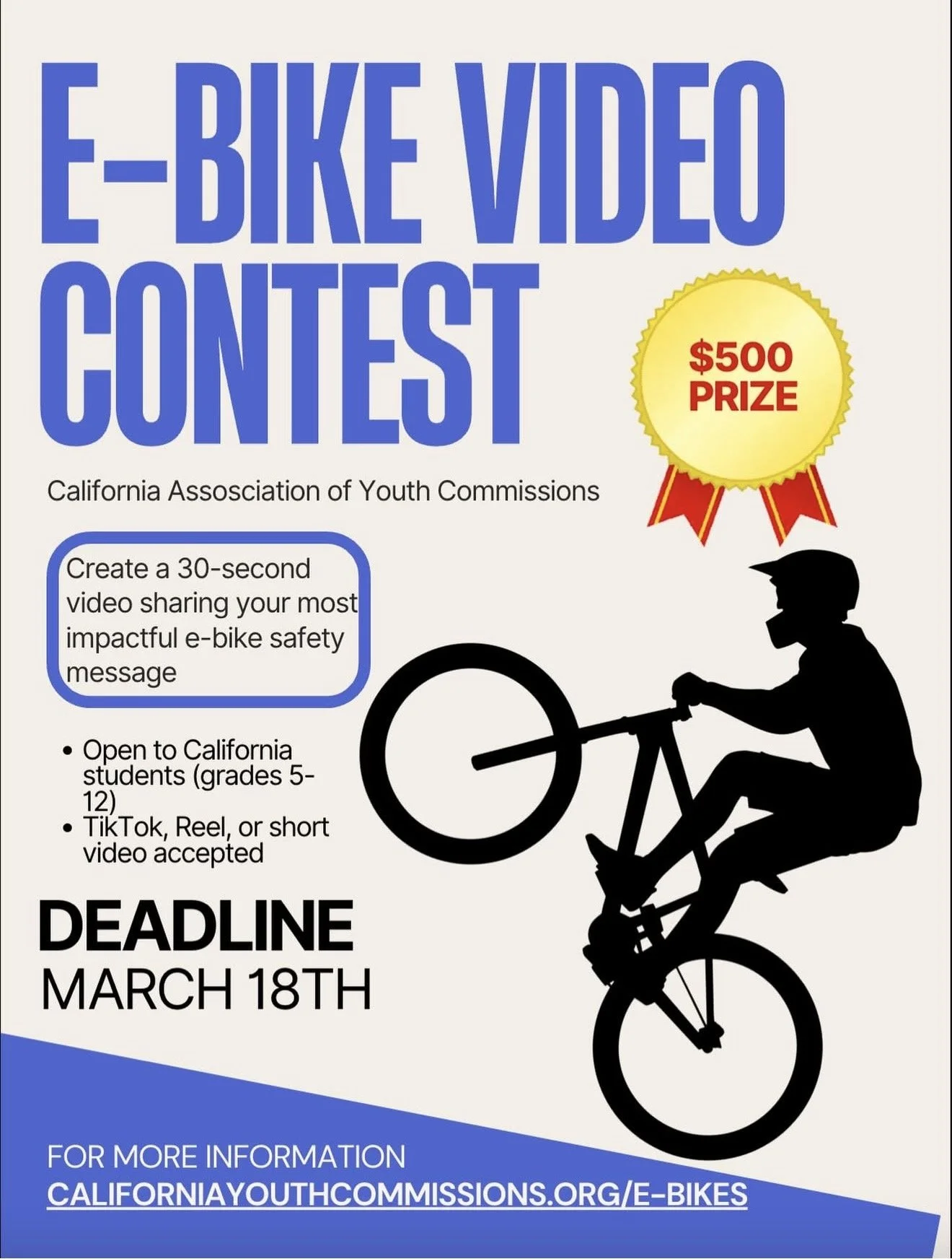 Submit a 30-second TikTok or video sharing the most impactful e-bike safety message by March 10 for a chance to win a $500 cash prize. Entries will be judged by our panel. Open to California students in grades 5-12.